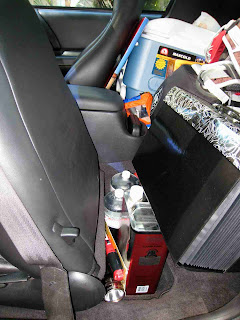 In spite of this, getting up at 7:00 on Wednesday to run a few errands like stopping by the bank, paying my car insurance early, and getting a few groceries. I washed my car, then resumed my packing and loading. I had the majority of the gear loaded by 6:30, but that still left a number of odds and ends to deal with, and precious little space in the car to squeeze them into. I also had my friend Jeff come over (at my invitation), and though I really appreciated the visit, it resulted in me not finishing loading the vehicle until around 1:30. I was still not happy with some of the arrangement of my gear (like electronics sitting on the passenger seat), but it was all in, except for the stuff 'd need in the morning.
